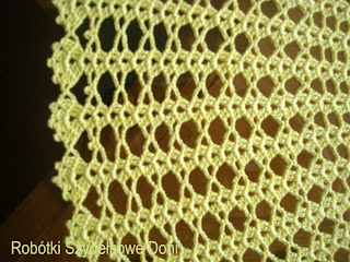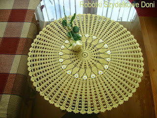 Dzisiaj mam przyjemność zaprezentować dużą okrągłą serwetę, która wykonana jest z żółtego kordonka Maxi, szydełkiem 1,50 a środek serwety ozdobiony jest białymi stokrotkami. Średnica to 55cm, schemat serwety dostałam od znajomej, który trochę przerobiłam według swojego pomysłu.