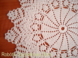 A teraz obrus, który w dalszym ciągu szydełkuje, jest prawie na wykończeniu, ponieważ już wypełniam środek między kwiatowymi elementami. Jak Wam się podoba? Myślę, że ten mały elemencik jest najodpowiedniejszy do tego obrusa. W nie długim czasie zaprezentuje już cały obrus.
