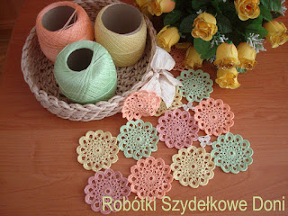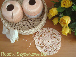 I jeszcze nowe zapowiedzi robótek, które mam w planach. Duża okrągła serweta w kolorze łososiowym i prostokątna kolorowa serweta wykończona koronką.