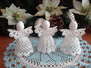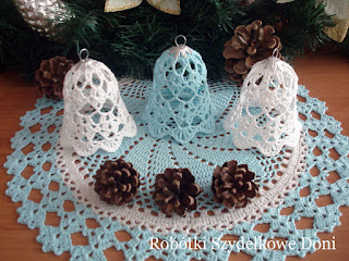 Jeszcze kilka ozdób świątecznych,między innymi: aniołki, dzwoneczki i gwiazdeczki, które wykonane są z kordonków Maxi w kolorze białym, turkusowym i biało-srebrnym, szydełkiem 1,50