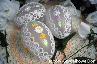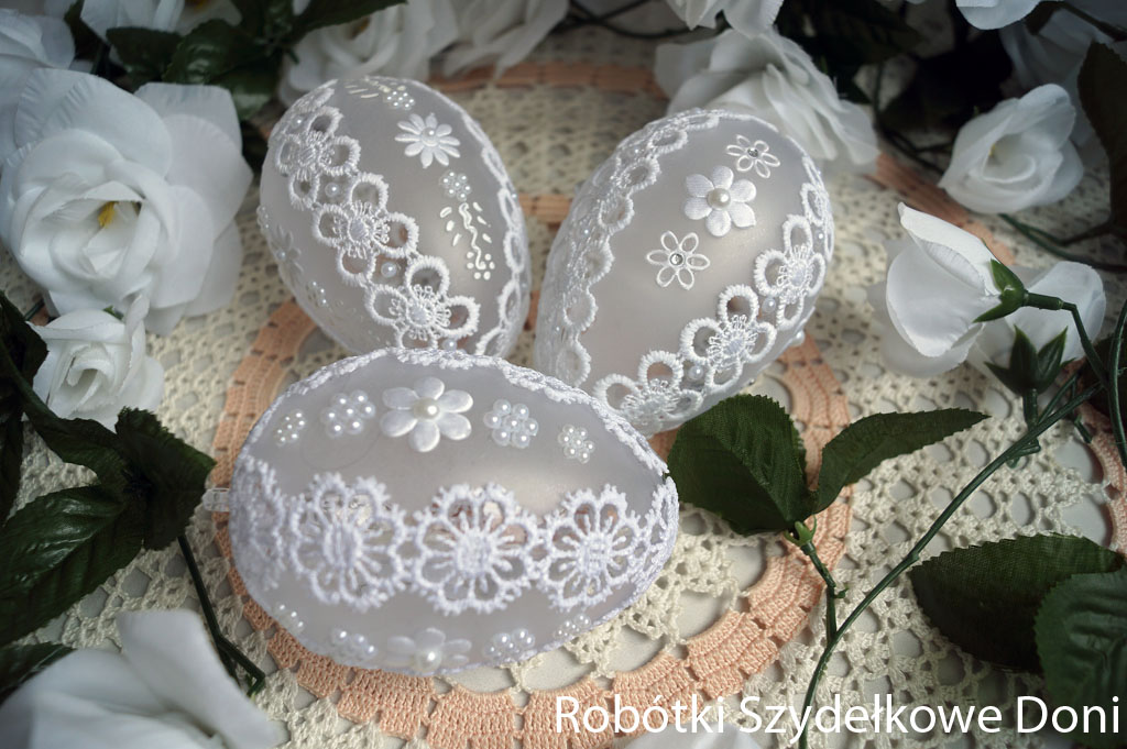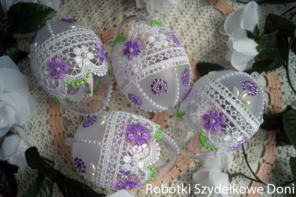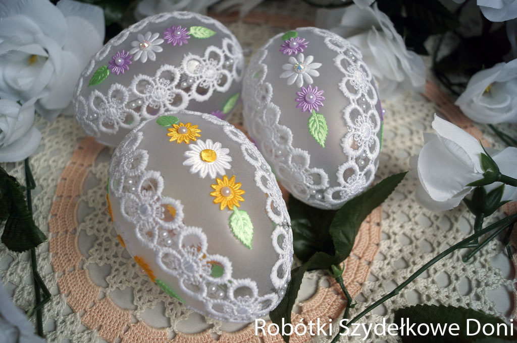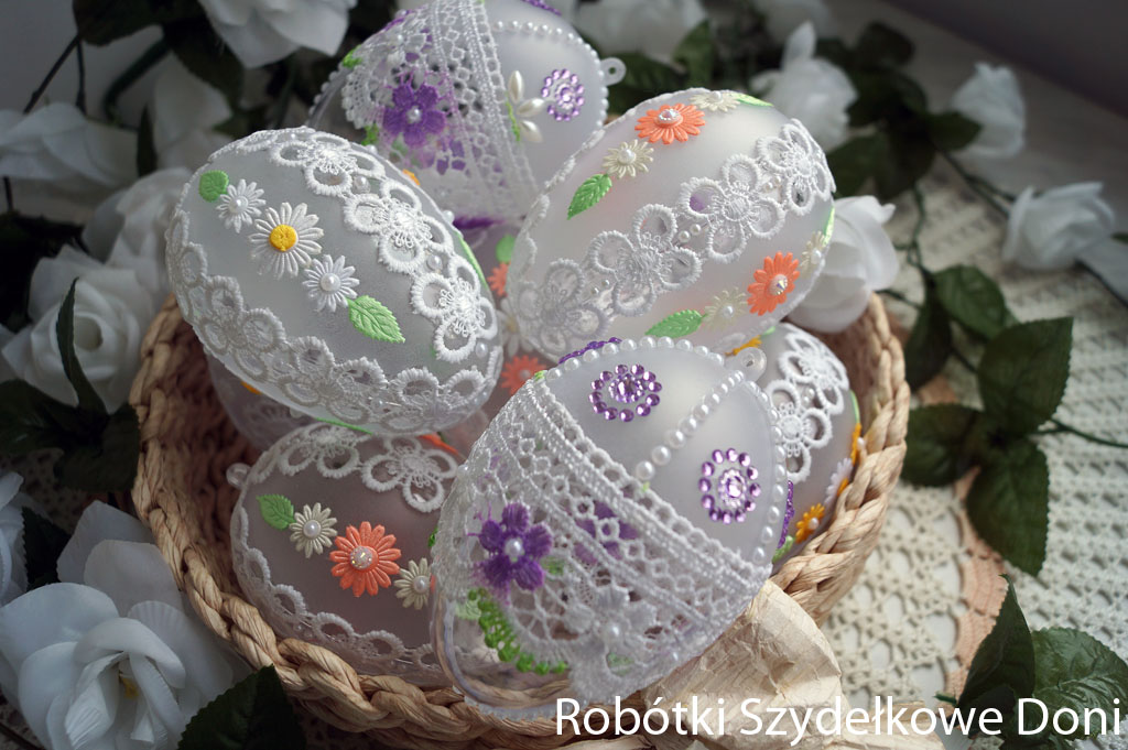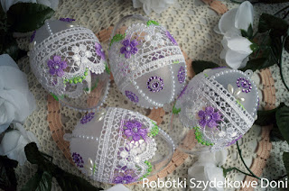 Na niektórych blogach już powstają pierwsze wielkanocne prace. Dzisiaj mam przyjemność zaprezentować swoje pierwsze wielkanocne ozdoby-jajeczka zdobione koronkami i kolorowymi ozdobami.Będą wspaniałym prezentem dla najbliższych i znajomych.