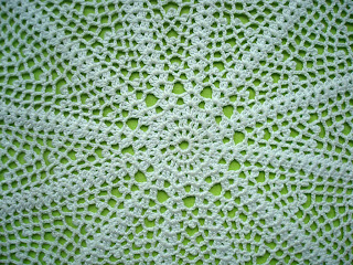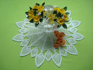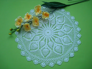 Z przyjemnością prezentuję serwetkę, którą w ostatnim czasie wydziergałam. Serwetka wykonana jest z kordonka Cable5, szydełkiem 1,25. Przyszyłam do serwetki małe różowe różyczki z zielona kokardką, aby dodały jej uroku i elegancji.
