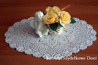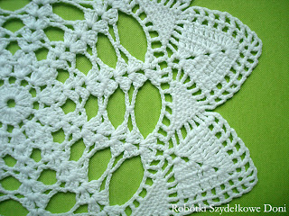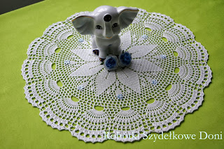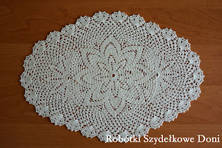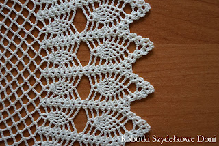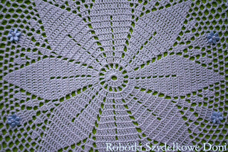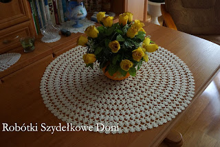 ( dla zainteresowanych dołączam wzór). Średnica wynosi 60cm. Serwetka jest środkiem obrusa i została wykończona ananasową koronką.