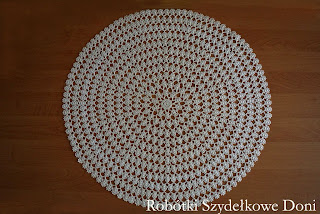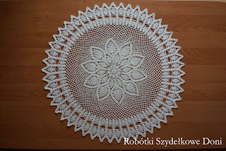 Mam przyjemność zaprezentować dużą okrągłą serwetę o której już od dawna marzyłam i w końcu postanowiłam ją  wydziergać. Serweta wykonana jest z kordonka Maxi w kolorze kremowym, szydełkiem 1,25. A tu Was troszkę zaskoczę ponieważ schemat serwetki pochodzi ze wzoru dużego okrągłego obrusa