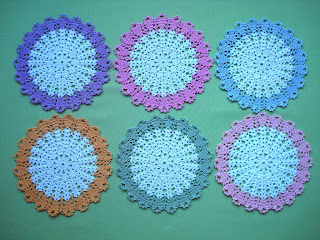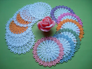 A teraz mam przyjemność zaprezentować dwa komplety małych kolorowych serwetek. Ciekawa jestem, który bardziej Wam się spodoba? Moim zdaniem obydwa komplety są eleganckie i gustowne. Serwetki wykonane są z kordonka Cable5 w różnych kolorach, szydełkiem 1,25. Dla zainteresowanych dołączam schemat.